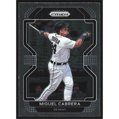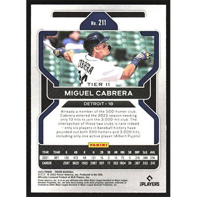 This is a 2022 Panini Prizm Miguel Cabrera baseball card. The card is #211 and pictures show condition.