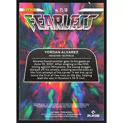 This is a 2022 Panini Prizm Fearless Yordan Alvarez baseball card. The card is #FL-16 and pictures show condition.