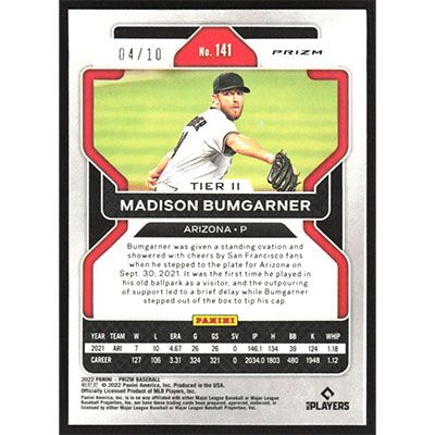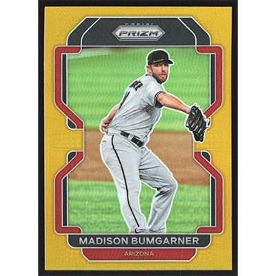 This is a 2022 Panini Prizm Gold Madison Bumgarner baseball card. The card is #141 and pictures show condition. This card is limited; #'d 04/10. Team(s): Arizona Diamondbacks