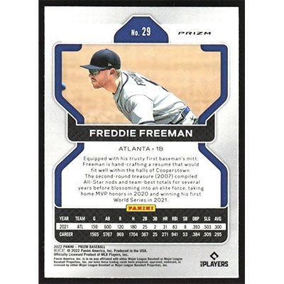 This is a 2022 Panini Prizm White Wave Freddie Freeman baseball card. The card is #29 and pictures show condition.