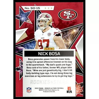 This is a 2022 Rookies & Stars Standing Ovation Nick Bosa football card. The card is #SO-15 and pictures show condition.