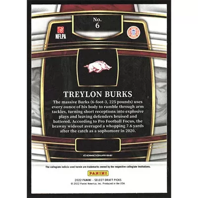 This is a 2022 Select Draft Picks Treylon Burks football card. The card is #6 and pictures show condition.