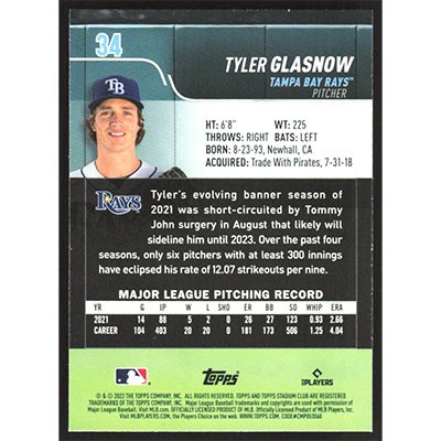 This is a 2022 Stadium Club Tyler Glasnow baseball card. The card is #34 and pictures show condition.