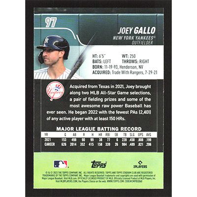 This is a 2022 Stadium Club Joey Gallo baseball card. The card is #97 and pictures show condition.