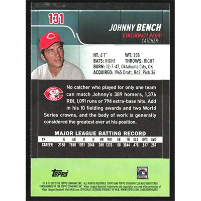 This is a 2022 Stadium Club Chrome Johnny Bench baseball card. The card is #131 and pictures show condition.