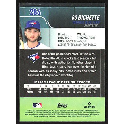 This is a 2022 Stadium Club Chrome Bo Bichette baseball card. The card is #286 and pictures show condition.
