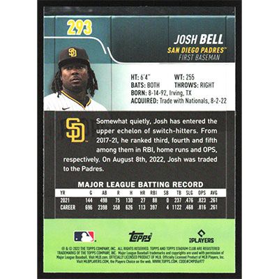 This is a 2022 Stadium Club Chrome Josh Bell baseball card. The card is #293 and pictures show condition.