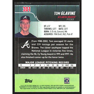 This is a 2022 Stadium Club Chrome Tom Glavine baseball card. The card is #301 and pictures show condition.
