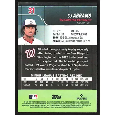 This is a 2022 Stadium Club Chrome CJ Abrams baseball card. The card is #31 and pictures show condition.