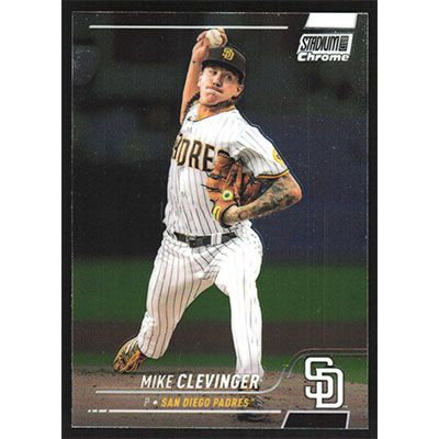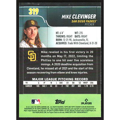 This is a 2022 Stadium Club Chrome Mike Clevinger baseball card. The card is #319 and pictures show condition.