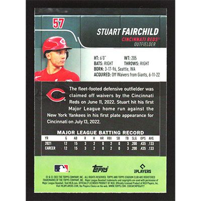 This is a 2022 Stadium Club Chrome Stuart Fairchild baseball card. The card is #57 and pictures show condition. Team(s): Cincinnati Reds Rookie Card (RC)