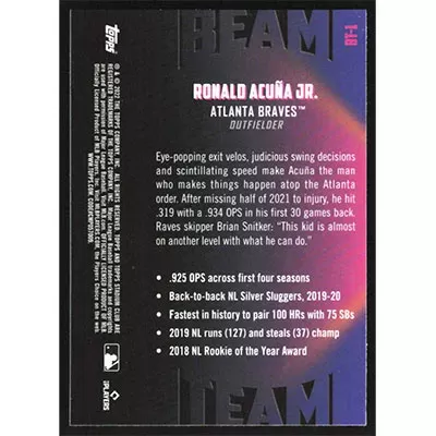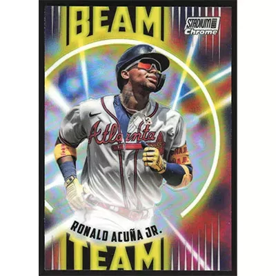 This is a 2022 Stadium Club Chrome Beam Team Ronald Acuña Jr. baseball card. The card is #BT-1 and pictures show condition.