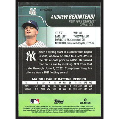 This is a 2022 Stadium Club Chrome Refractors Andrew Benintendi baseball card. The card is #46 and pictures show condition.