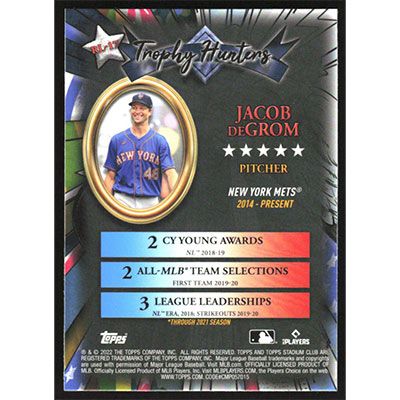 This is a 2022 Stadium Club Chrome Trophy Hunters Jacob deGrom baseball card. The card is #RL-17 and pictures show condition.