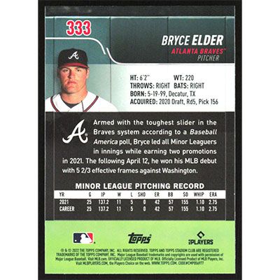 This is a 2022 Stadium Club Chrome X-Fractors Bryce Elder baseball card. The card is #333 and pictures show condition. Team(s): Atlanta Braves Rookie Card (RC)