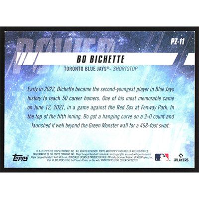This is a 2022 Stadium Club Power Zone Bo Bichette baseball card. The card is #PZ-11 and pictures show condition.