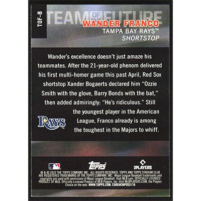This is a 2022 Stadium Club Team of the Future Wander Franco baseball card. The card is #TOF-8 and pictures show condition. Team(s): Tampa Bay Rays Rookie Card (RC)