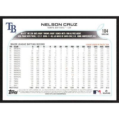 This is a 2022 Topps Nelson Cruz baseball card. The card is #104 and pictures show condition.