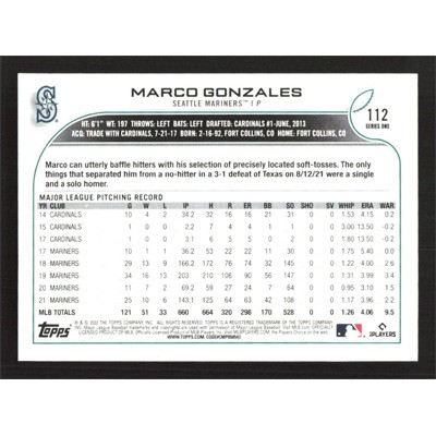 This is a 2022 Topps Marco Gonzales baseball card. The card is #112 and pictures show condition.