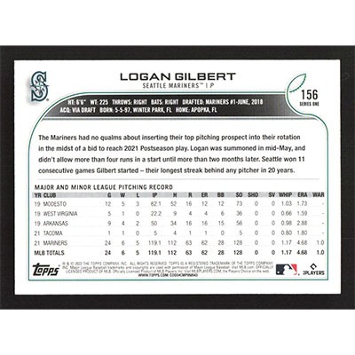 This is a 2022 Topps Logan Gilbert Future Stars baseball card. The card is #156 and pictures show condition.