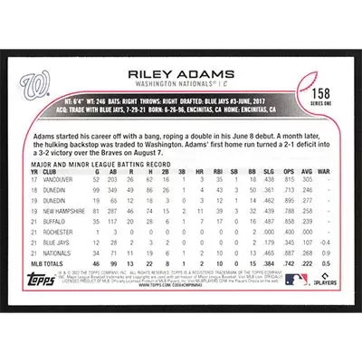 This is a 2022 Topps Riley Adams baseball card. The card is #158 and pictures show condition.
