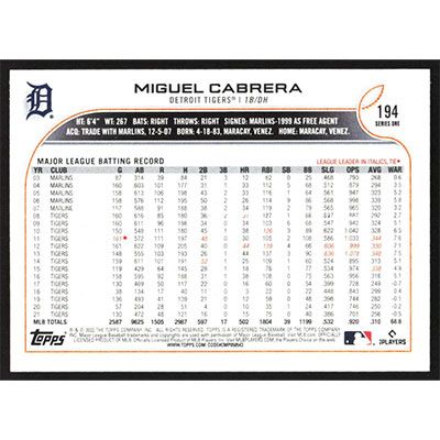 This is a 2022 Topps Miguel Cabrera baseball card. The card is #194 and pictures show condition.