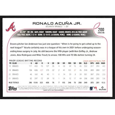 This is a 2022 Topps Ronald Acuña Jr. baseball card. The card is #200 and pictures show condition.
