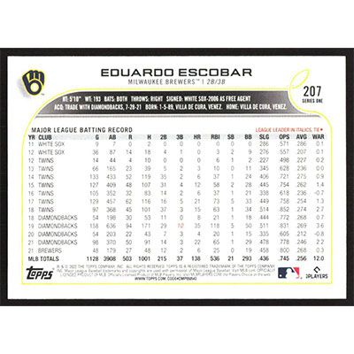 This is a 2022 Topps Eduardo Escobar baseball card. The card is #207 and pictures show condition.