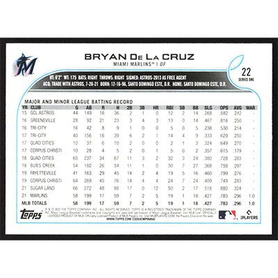 This is a 2022 Topps Bryan De La Cruz baseball card. The card is #22 and pictures show condition.