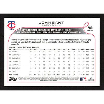 This is a 2022 Topps John Gant baseball card. The card is #280 and pictures show condition.