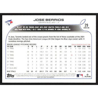 This is a 2022 Topps Jose Berrios baseball card. The card is #29 and pictures show condition.