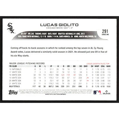 This is a 2022 Topps Lucas Giolito baseball card. The card is #291 and pictures show condition.