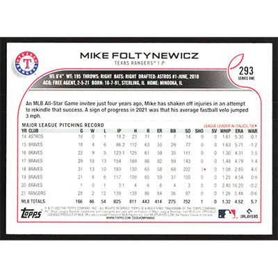 This is a 2022 Topps Mike Foltynewicz baseball card. The card is #293 and pictures show condition.