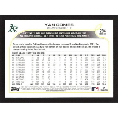 This is a 2022 Topps Yan Gomes baseball card. The card is #294 and pictures show condition.