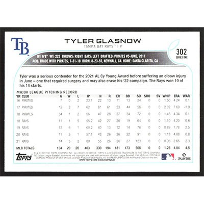 This is a 2022 Topps Tyler Glasnow baseball card. The card is #302 and pictures show condition.