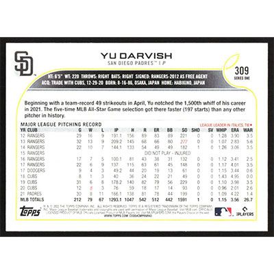 This is a 2022 Topps Yu Darvish baseball card. The card is #309 and pictures show condition.