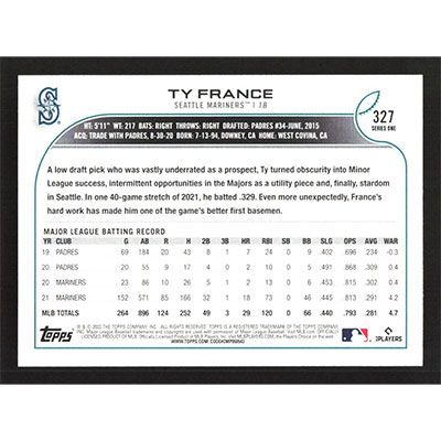 This is a 2022 Topps Ty France baseball card. The card is #327 and pictures show condition.