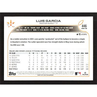 This is a 2022 Topps Luis Garcia baseball card. The card is #446 and pictures show condition.