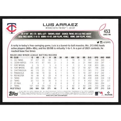 This is a 2022 Topps Luis Arraez baseball card. The card is #453 and pictures show condition.