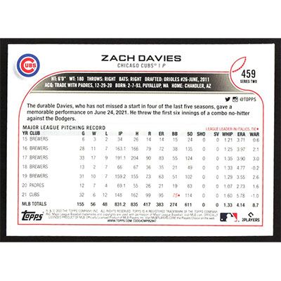 This is a 2022 Topps Zach Davies baseball card. The card is #459 and pictures show condition.