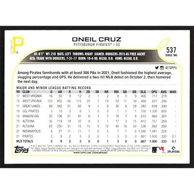 This is a 2022 Topps Oneil Cruz baseball card. The card is #537 and pictures show condition.