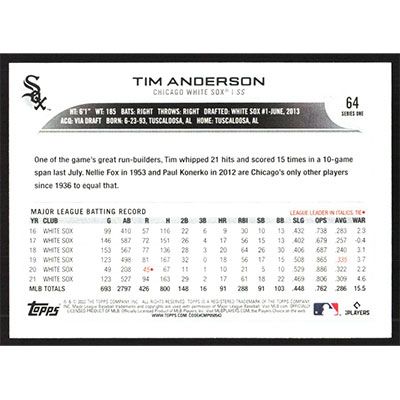 This is a 2022 Topps Tim Anderson baseball card. The card is #64 and pictures show condition.