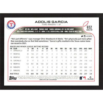 This is a 2022 Topps Adolis Garcia baseball card. The card is #652 and pictures show condition.