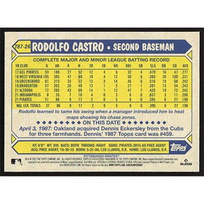 This is a 2022 Topps '87 Blue Rodolfo Castro baseball card. The card is #T87-26 and pictures show condition. Team(s): Pittsburgh Pirates Rookie Card (RC)