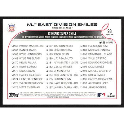 This is a 2022 Topps Jazz Chisholm Jr. and Francisco Lindor NL East Division Smiles Checklist baseball card. The card is #98 and pictures show condition.
