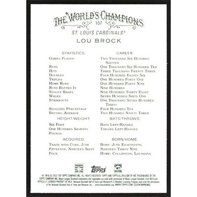 This is a 2022 Topps Allen & Ginter Lou Brock baseball card. The card is #107 and pictures show condition.