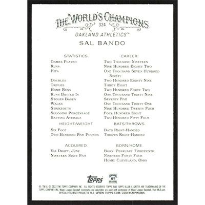 This is a 2022 Topps Allen & Ginter Sal Bando short print baseball card. The card is #324 and pictures show condition.