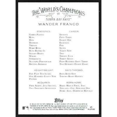 This is a 2022 Topps Allen & Ginter Wander Franco baseball card. The card is #91 and pictures show condition. Team(s): Tampa Bay Rays Rookie Card (RC)