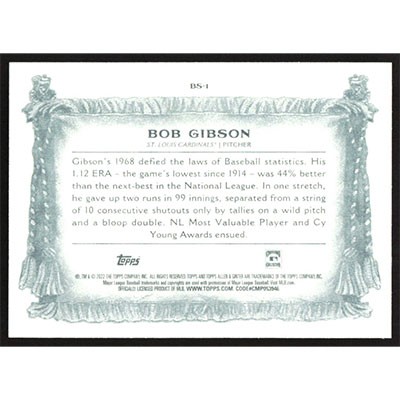 This is a 2022 Topps Allen & Ginter Banner Seasons Bob Gibson baseball card. The card is #BS-1 and pictures show condition. Team(s): St. Louis Cardinals