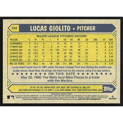 This is a 2022 Topps Archives Lucas Giolito baseball card. The card is #294 and pictures show condition.